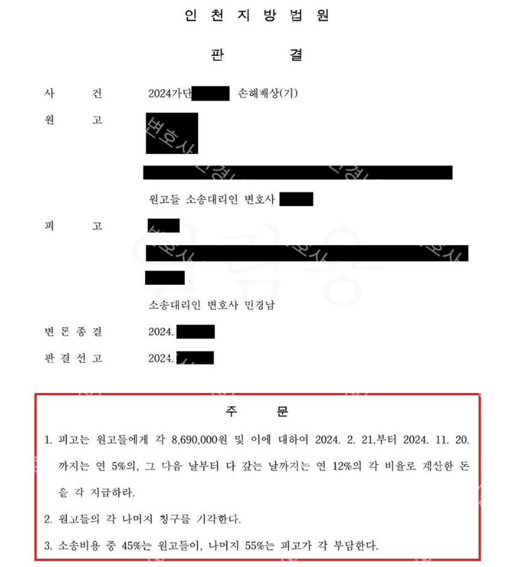 다만, 재판부에서는 매도인의 하자담보책임은 무과실책임이라는 점에서 피고의 손해배상책임은 인정하되 그 금액에 있어서 정신적 손해배상은 원고들이 전부 패소하고, 나머지 하자담보책임에 있어서만 일부 인정을 하는 것으로 사건을 마무리 할 수 있었습니다.