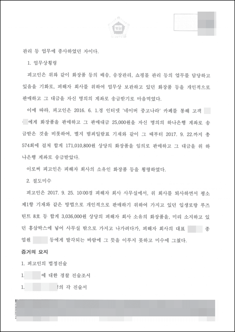 본 사건 의뢰인께선 온라인 화장품 판매 회사 직원으로 재직 중 회사의 화장품을 몰래 빼돌려 중고 판매 사이트에 판매하는 방식으로 총 574회에 걸쳐 1억7천여만 원의 부당 이득을 취하였고, 이 사실을 알게 된 회사 대표에 의해 해고당하여 퇴사하는 날에도 3백여만 원 상당의 화장품을 절도하려다가 미수에 그친 혐의로 정식 기소되었습니다.