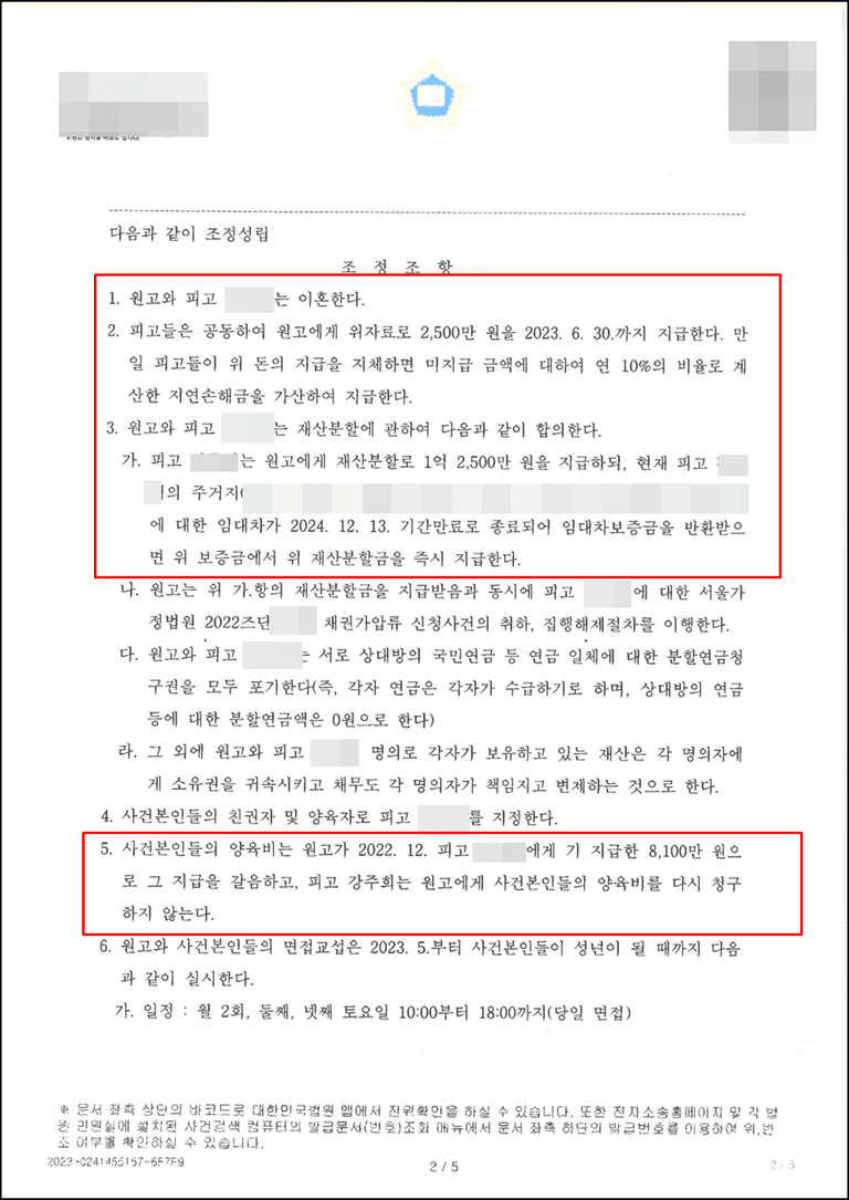 4. 의뢰인 아내가 의뢰인에게 1억2천5백만 원의 재산분할을 지급할 것을 인정
