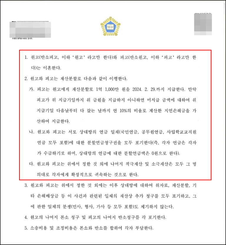 3. 본 사건 조정 내용 이외에 모든 청구(위자료, 연금분할청구권, 각자 명의 특유 재산 등) 모두 배척