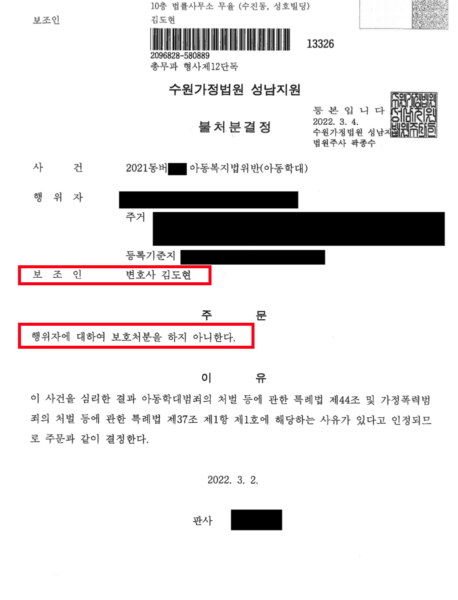 불처분 결정! 의뢰인은 아이에 대한 사랑이 가득한 사람으로 피해아동도 이를 잘 알고 있었습니다. 이 사건이 발생한 경위에 대한 정확한 설명을 통해 처분의 필요성이 없음을 변론한 것이 주요한 사건이었습니다. 법률사무소 무율은 의뢰인과 함께 사건을 바라보며, 끝까지 최선을 다합니다. 의뢰인을 이해하는 법률사무소 무율과 함께 하시길 바랍니다.