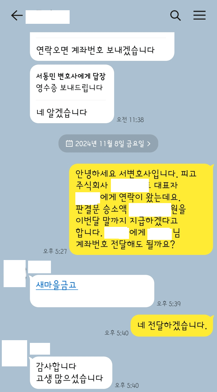 저는 즉각 입금 받은 법인을 피고로 하여 민사소송 부당이득반환청구소송을 제기하였고 법원은 원고 승소 판결을 선고하였으며 판결문을 받은 피고 법인 대표자가 저희에게 연락하여 판결문 금액을 지급하였습니다.
