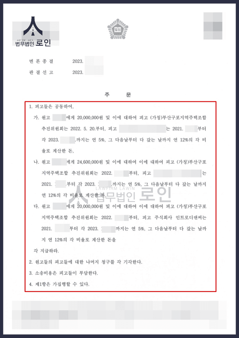 그 결과 재판부는 조합원 승소 판결을 선고했고, 의뢰인들은 납입금 전액을 환불받을 수 있게 되었는데요.