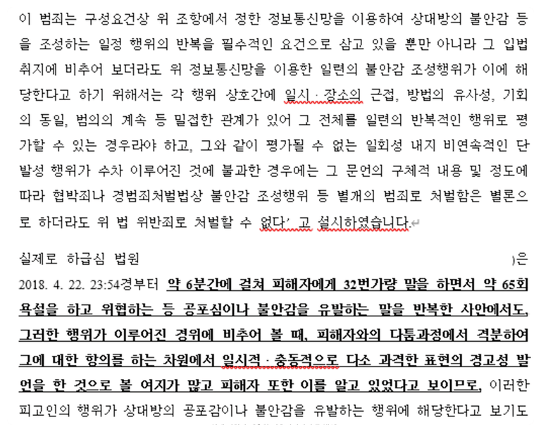 불안감조성과 관련하여서는 '불안감을 일으킬 정도', 반복성' 위 2가지 요건이 성립하기 어렵다는 점을 하급심 판례를 근거하여 부정해 보았습니다.