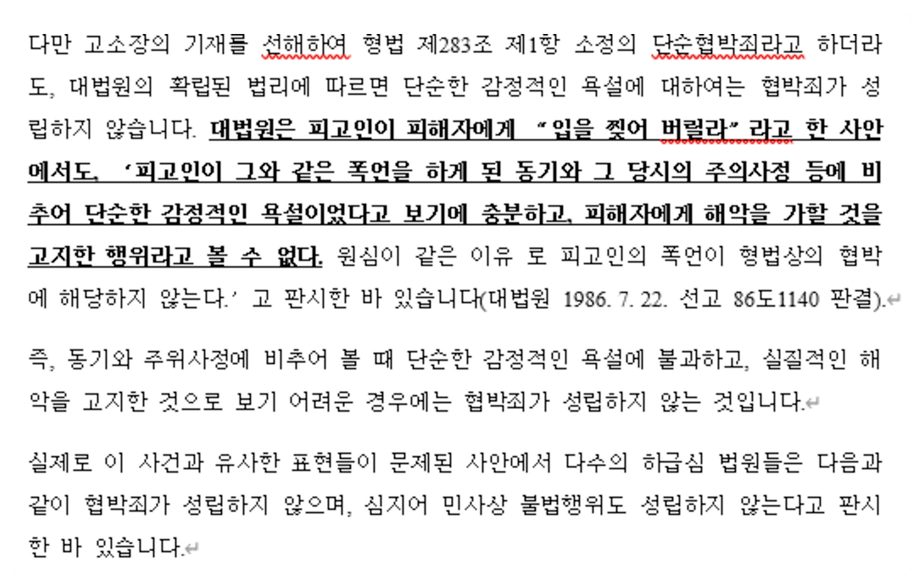 실제 저희가 협박죄를 부정할 당시 제출한 변호인 의견서 일부입니다. : )