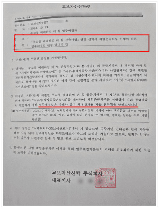 입주예정일을 코앞에 두고 여러가지 사정을 이유로 대며 수분양자들에게 입주지연을 일방적으로 통보하는 사례가 매우 많아졌습니다.