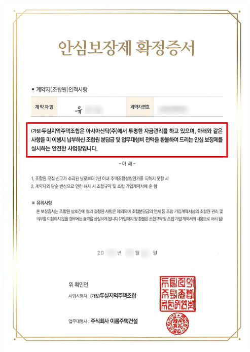저희 법인에서는 이미 두실 지역주택조합을 상대로 승소하여 의뢰인의 판결금을 회수해 드린 바 있기 때문에, 이러한 축적된 경험을 토대로 의뢰인의 계약 전반에 대한 검토를 진행해 드렸고, 해당 의뢰인들 또한 아래와 같이 "조합원 모집 신고가 수리된 날로부터 2년 이내 주택조합설립인가를 득하지 못할 시 납부하신 조합원 분담금 및 업무대행비 전액을 환불하여 드리는 안심 보장제를 실시하는 안전한 사업장입니다"라고 기재된 안심보장제 확정증서를 보유하고 계셨기 때문에 충분히 승소가 가능하심을 알려드렸습니다.