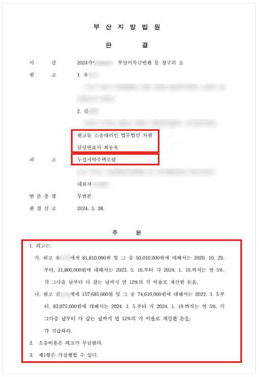 이에 의뢰인들께서는 법률검토 후 소송을 위임하시게 되었고, 최동욱 변호사는 의뢰인들을 대리하여 조합에서 교부한 안심보장제 확정증서를 비롯한 조합측의 여러가지 위법사항을 입증·주장하였습니다. 이에 부산지방법원은 아래와 같이 두실 지역주택조합으로 하여금 의뢰인들에게 각 1억 5700만원 및 8180만 원을 반환하라는 전액 승소판결을 선고하였습니다.