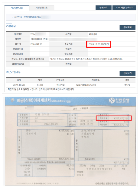 이에 최동욱 변호사는 집행권원을 토대로 조합을 상대로 채권압류 등의 강제집행을 실시하였고, 의뢰인들께서는 최근인 2024. 10. 29. 아래와 같이 법원의 배당절차를 통해 피해금원 1억 5700만원 및 8180만 원 전액을 실제로 회수하셔서 사건이 성공적으로 종결 되었습니다.