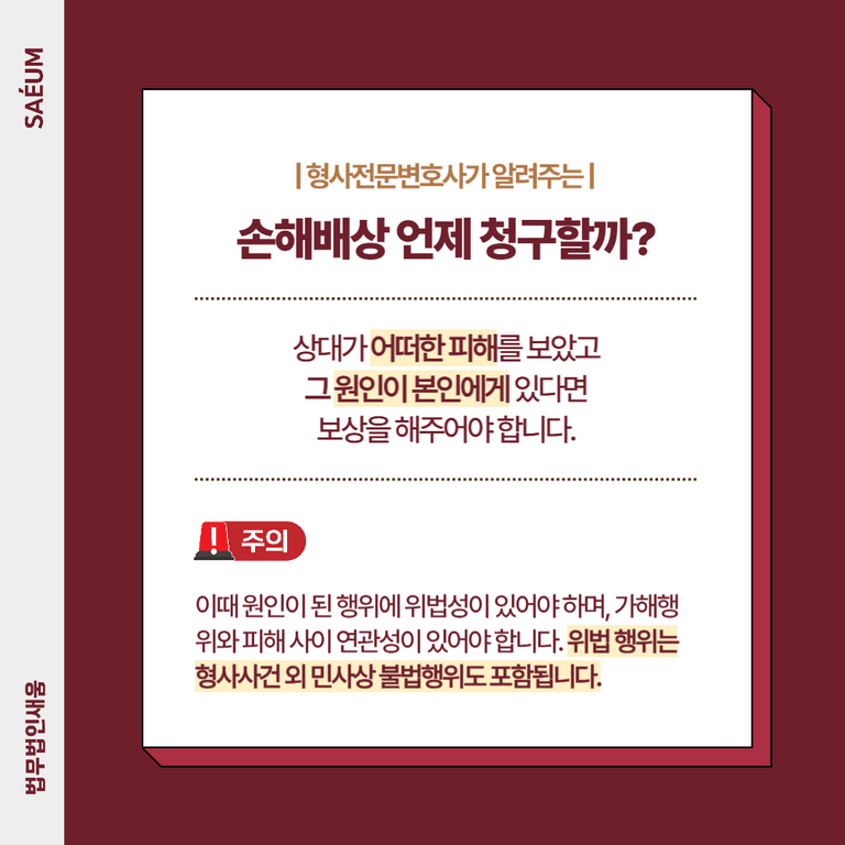 상대방이 어떠한 피해를 보게 되었고, 그 원인이 본인에게 있다면 보상을 해주어야 합니다. 이때 원인이 된 행위에 위법성이 있어야 하며, 가해행위와 피해 발생에 대한 연관성이 있어야 합니다.