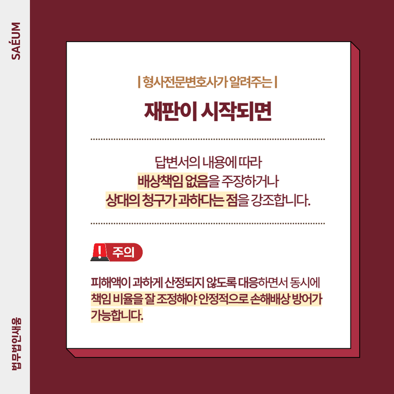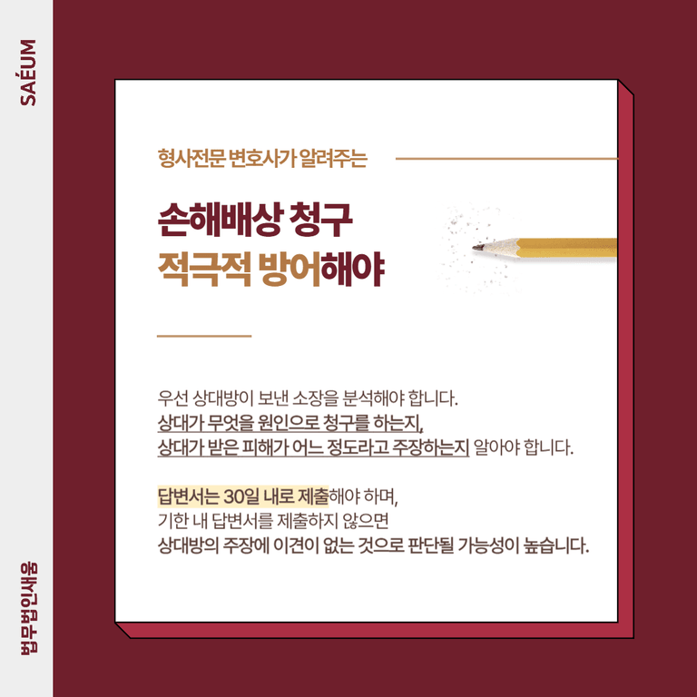 상대방이 청구한 원인과 본인이 관계가 없다고 생각이 되는 경우 자신은 배상책임이 없다는 내용만 되풀이하며 대응하는 분들이 있습니다. 그러나 민사의 경우 수사기관에서 사건의 사실관계를 입증해 주거나 도움을 주는 것이 아니기 때문에 제대로 대응하지 못하면 그대로 상대방의 청구가 인정될 수 있습니다.