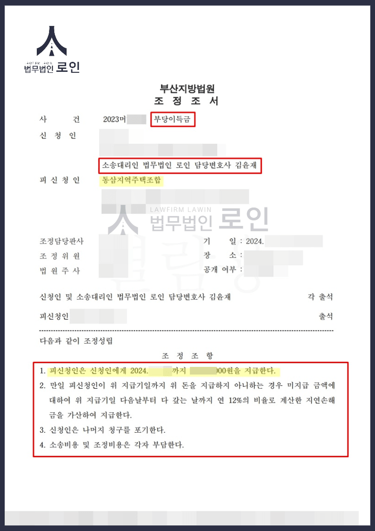 조정기일에서 해당 조합은 빠른 사업 추진을 위해서 이 문제를 신속히 해결하고 싶어 했고, 무엇보다 안심보장증서가 있었기에 소송으로 갈 경우 안심보장증서의 효력이 문제될 수 있다고 판단한 것인지 조정에 적극 응해주어 조정이 성립되었습니다.