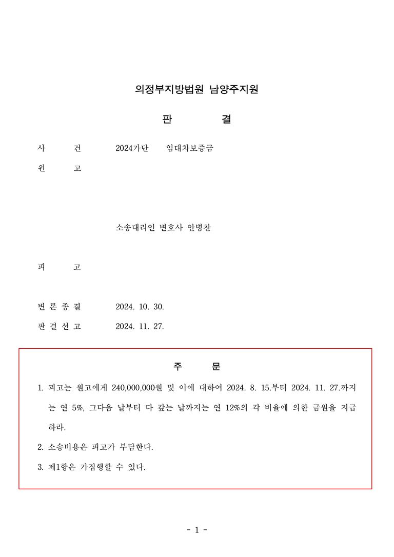 의뢰인은 보증금반환청구소송을 진행하여 보증금, 법정이자, 12% 소촉법상 지연이자를 받아내는 판결을 받아냈습니다. 추후 소송비용확정으로 변호사 비용도 받아낼 예정입니다.