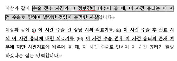 또한 수술과 관련된 의료차트를 통하여, 고소인 병원 측 역시 수술 이후에 흉터의 존재를 인식하게 되었다는 점을 확인하였고 이를 통하여 수사기관을 설득하였습니다.