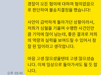 저희가 피의자조사 단계부터 주말과 새벽을 반납하며 준비하고, 변호인의견서 역시 치밀하게 준비하여 주장한 결과, 저희 의뢰인께서는 경찰 단계에서 바로 불송치결정(혐의없음)을 받게 되었습니다.
