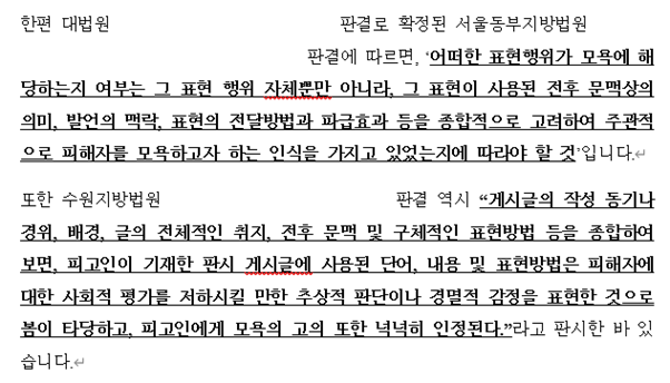 이번 사건에서 가장 중점적으로 염두에 두었던 것은 과연 “사회상규에 위배되는 모욕적 표현”이 있었는지 여부입니다.
