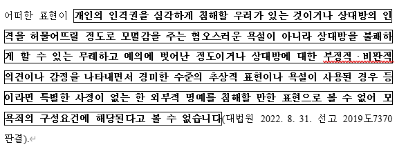 나아가 예비적 주장도 빠질 수 없겠죠. 저희는 대법원의 기본적인 입장과 유사 사안에서의 법원 판결례를 바탕으로 개인의 인격권을 심각하게 침해할 우려가 있는 것이 아닌, 단지 경미한 수준의 추상적 표현이라면 모욕죄의 구성요건에 해당되지 않으므로 모욕적 행위에 해당하지 않는다는 점을 강하게 주장하였습니다.