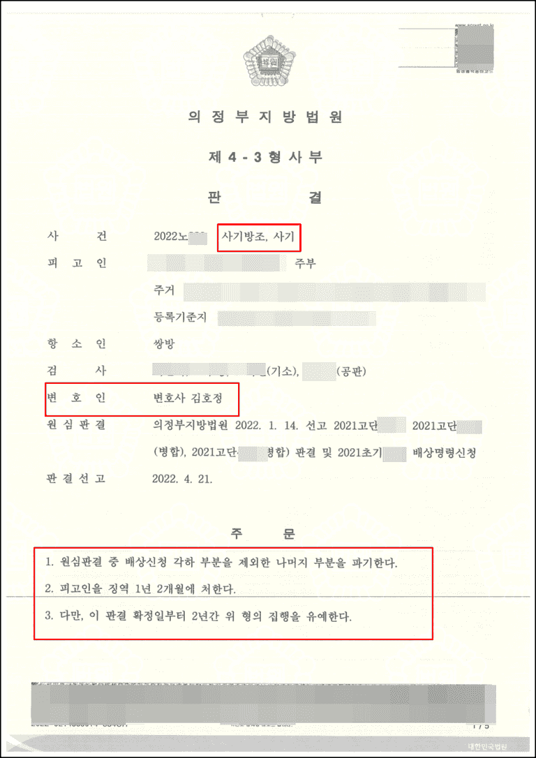 본 사건 의뢰인께선 보이스피싱 범죄 조직의 허위 구인 광고에 속아 현금 수거책 가담 행위로 1심에서 1년 2개월의 징역형 실형을 선고받았습니다.