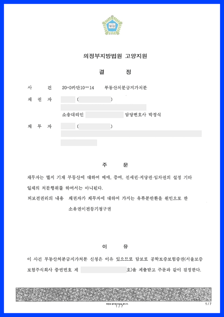 ② 채권자가 가처분을 하는 대상 부동산은 채무자는 피상속인으로부터 증여받은 부동산이 분명하므로 채무자는 해당 부동산 중 채권자의 유류분에 해당하는 지분을 반환할 책임이 있다고 보아, 채권자의 처분금지가처분 신청을 이유 있는 것으로 보고 담보로 공탁보증보험증권을 제출받는 방법으로 소정의 금원을 공탁하게 하고, 부동산처분금지가처분 결정을 한 사안입니다.