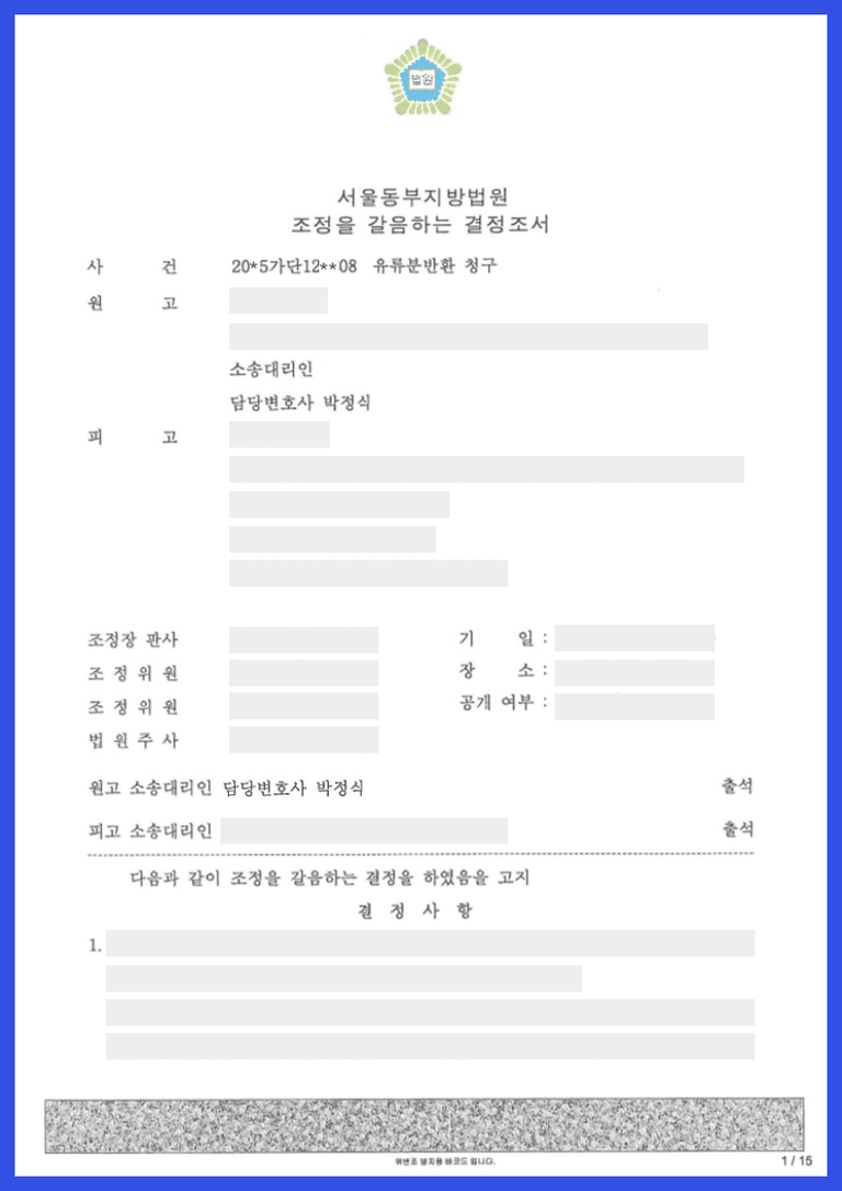 ③ 또한 원고가 이 사건 소를 제기한 것은 부친이 사망한지 2년 이상이 지난 시점이지만, 부친의 유류분반환청구권 장남에게 양도되었다는 것을 알게 된 것은 관련소송에서 장남이 양도양수계약서를 제출하여 알게 된 것으로 보이므로 안 날로부터 1년이 경과하지 않은 것으로 보아 장남의 소멸시효가 완료되었다는 주장은 이유없다고 판단하여 장남이 차녀에게 부친의 유류분반환청구권에 따른 유류분부족액 중 다른 자녀의 유류분에 해당하는 가액을 반환하라는 조정을 갈음하는 결정(강제조정결정)이 났고 쌍방이 이에 이의하지 않아서 조정내용대로 확정이 된 사건입니다.