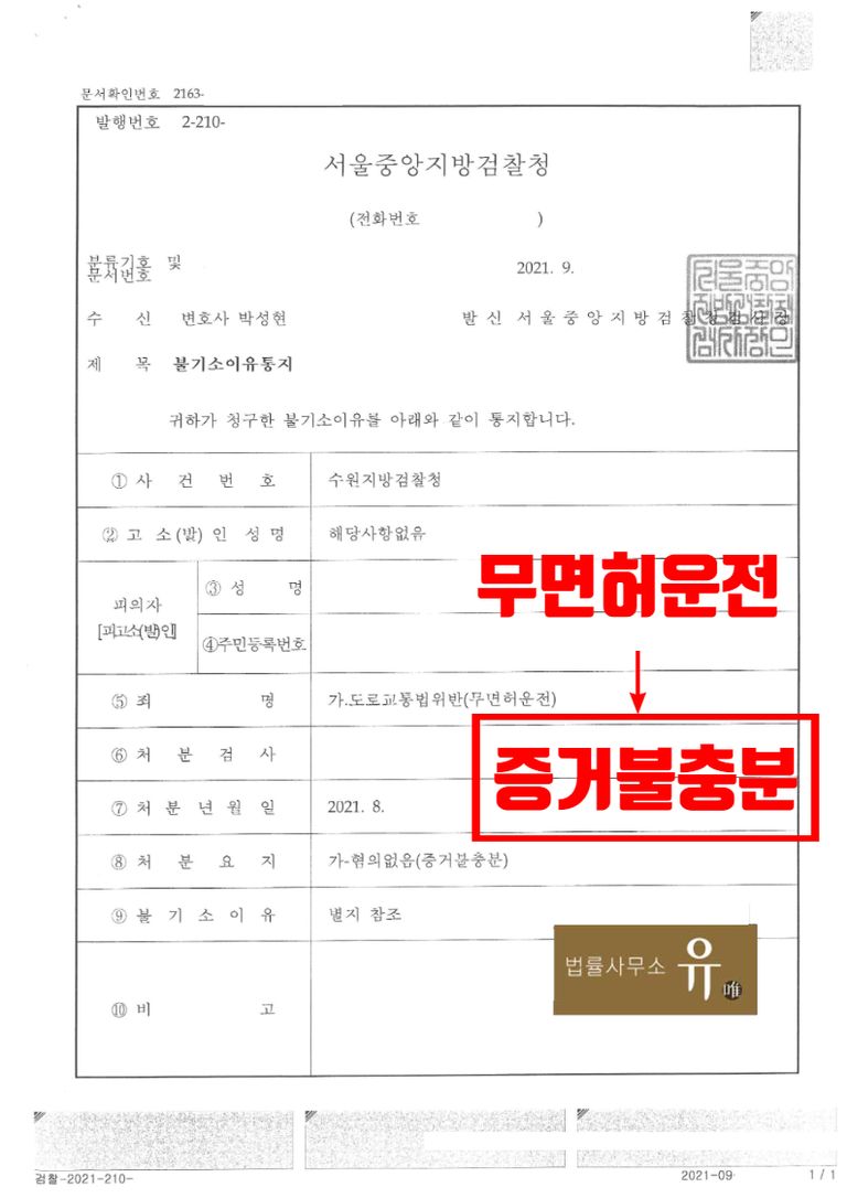 수원지방검찰청은 법률사무소 유의 형사전문변호사가 제출한 변호인의견서를 참작하여, 의뢰인이 특수운전면허 없이 특수차량을 운전한 사실은 인정되나, 적법한 면허가 있다고 착각하고 운전한 것으로 고의가 없었다고 판단하여 불기소(혐의없음) 처분을 하였습니다.