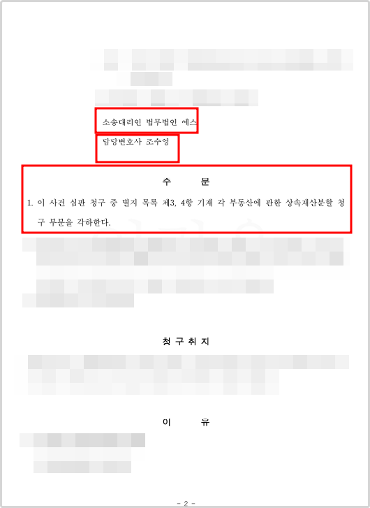 이에 대해 재판부는 저희 측 주장을 받아들여 상속재산 일부에 대한 상속재산분할협의는 유효하고, 이에 대한 청구인들의 소유권이전등기는 상속회복청구에 해당하며 이미 제척기간이 도과되어 각하되었다는 판결을 내렸습니다.