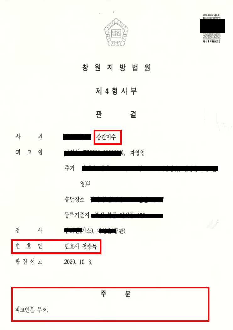 변호인은 재판도중에 피해자 진술의 전부에 대하여 세부적으로 신빙성을 탄핵하였고, cctv영상의 검증절차를 통하여 피고인의 무죄를 밝힌 사안입니다.