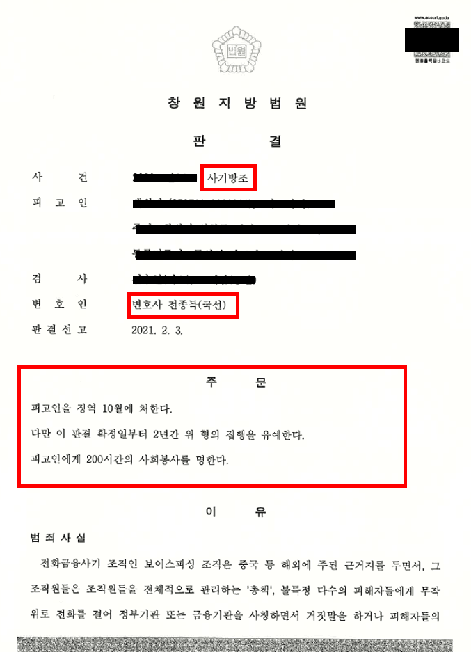 피고인의 보이스피싱의 고의성이 없다는 점, 피해자와의 합의 등을 진행하여 집행유예 판결은 받은 사례입니다.
