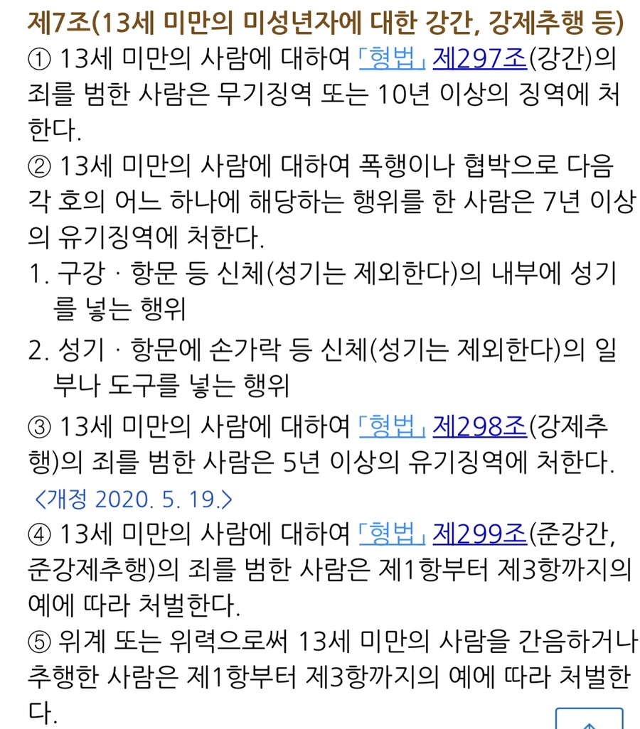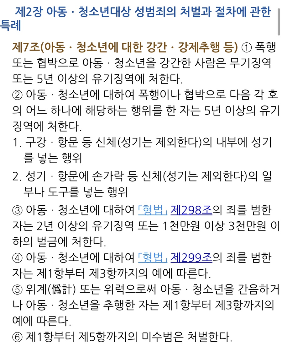 또한 그 대상이 미성년자인 경우 연령에 따라 처벌 규정과 수위가 달리 규정되어 있는데, 만 13세 미만의 미성년자인 경우에는 '성폭력범죄의 처벌 등에 관한 특례법'상 5년 이상의 유기징역에, 만 13세 이상 만 19세 미만의 경우에는 '아동ㆍ청소년의 성보호에 관한 법률'상 2년 이상의 유기징역 또는 1,000만 원 이상 3,000만 원 이하의 벌금에 처해집니다.