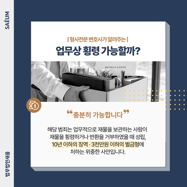 결론적으로 답변을 드리자면 충분히 가능합니다. 해당 범죄는 업무적으로 타인의 재물을 보관하는 사람이 해당 재물을 횡령하거나 반환을 거부하였을 때 성립합니다. 형법 제355조에 따라 10년 이하의 징역 또는 3,000만 원 이하의 벌금형에 처하는 위중한 사안입니다.