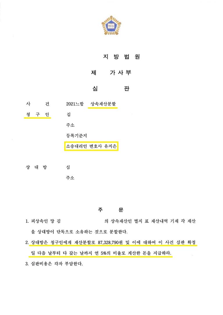 결국 상대방의 기여분은 하나도 인정되지 않았고, 상대방이 생전에 증여받은 재산을 전부 찾아내어 법정상속분인 5분의 2보다 더 많은 상속분을 받아올 수 있었고, 상속재산분할 방법으로도 의뢰인이 원하는대로 가액으로 정산받음으로써 성공적으로 마무리 한 사안입니다.