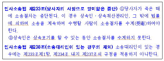 변호사가 선임되어 있는 경우에는 앞서 말했듯이 당사자가 사망해도 소송절차의 중단없이 소송이 진행됩니다.