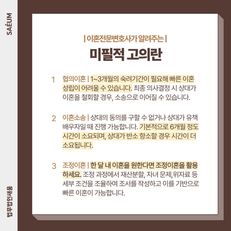 일반적으로 협의로 헤어지게 되는 경우 상호 간에 뜻이 맞기 때문에 빠르게 헤어질 수 있으리라 생각하는 분들이 많습니다. 협의 방식이 소송에 비해서 빠른 이혼이 가능한 것은 맞지만, 신중하게 의사결정을 하도록 숙려기간을 거처야 하기에 어느 정도는 시간이 필요할 수밖에 없습니다.