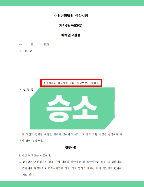 법무법인 새움에서는 안정적으로 조정이혼이 가능하도록 B씨를 설득하여 이혼에 동의하고 협조적으로 응할 수 있게끔 조력을 더하였습니다. 적극적으로 A씨를 대신해 상대방을 설득하여 빠른 이혼이 가능해지게 되었는데요. 의뢰인 A씨가 법무법인 새움에 사건을 의뢰한 후 한 달 만에 화해권고결정을 이끌어냈고, 이를 통해 한 달 내 이혼이 가능해지게 되었습니다.