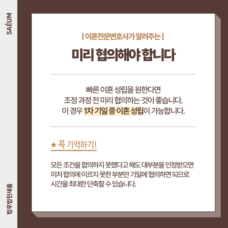 만일 빠른 이혼을 바란다면 본격적인 조정 과정에 들어서기 전에 미리 어느 정도 조율을 해두는 것이 좋습니다. 본격적인 조정기일이 잡히기 전에 상호 간에 대부분의 협의를 마쳐둔 상황이라면 1차 기일에서 바로 성립하도록 하여 더욱 빠르게 법률혼 관계를 해소할 수 있습니다.