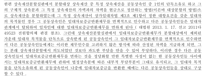 (3) 따라서 부동산을 단독으로 물려받은 상속인이 임차인에게 보증금을 전액 반환했더라도, 다른 상속인들에게 각자의 법정상속분에 해당하는 금액을 청구할 수 있다고 보았습니다.