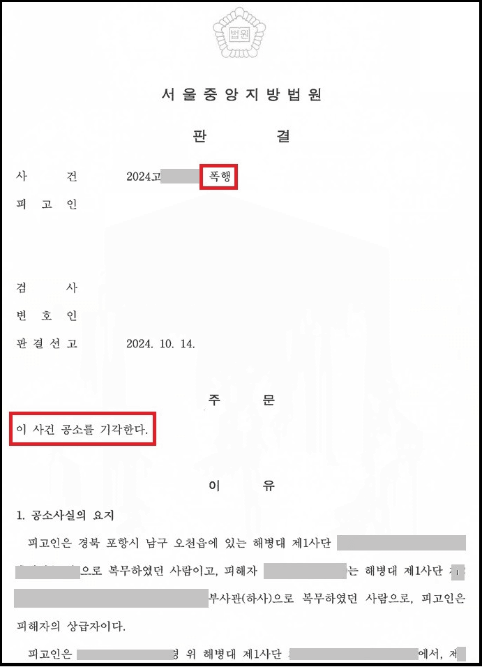 이에 캡틴법률사무소는 직속상관으로서 훈련간 불량한 태도를 지적하며 한 차례 때린 사실 자체는 인정하면서도, 그 정도가 상해에 이르지 않았음을 변론하여 폭행치상이 아닌 단순 폭행으로 죄명이 변경될 수 있도록 노력하였습니다.