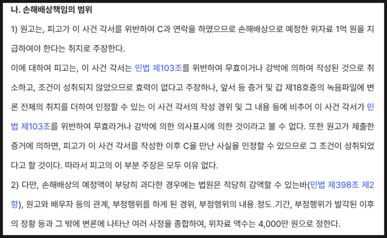 실제 서울서부지방법원 2022가단241359 판결에서도 "손해배상의 액정액이 부당히 과다한 경우에는 법원은 직권히 감액할 수 있다"고 판시한 바 있습니다.