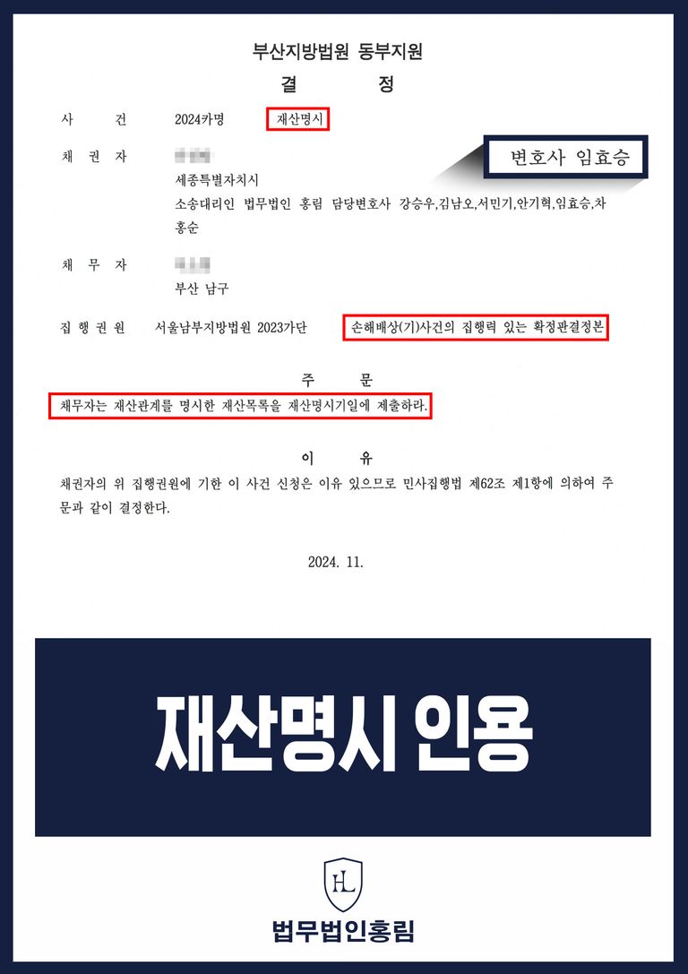 그 결과 법원에서는 변호인의 의견을 받아들여 채무자는 재산관계를 명시한 재산목록을 재산명시기일에 제출할 것을 판시하였습니다.