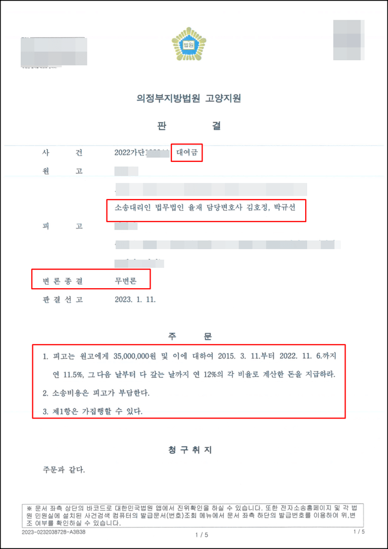 이에 의뢰인께선 돈을 빌려준 지 7년이 지난 시점에서 인간관계를 끊겠다는 심정으로 저희 율재를 찾아주시어 대여금 청구 소송을 의뢰하였습니다.