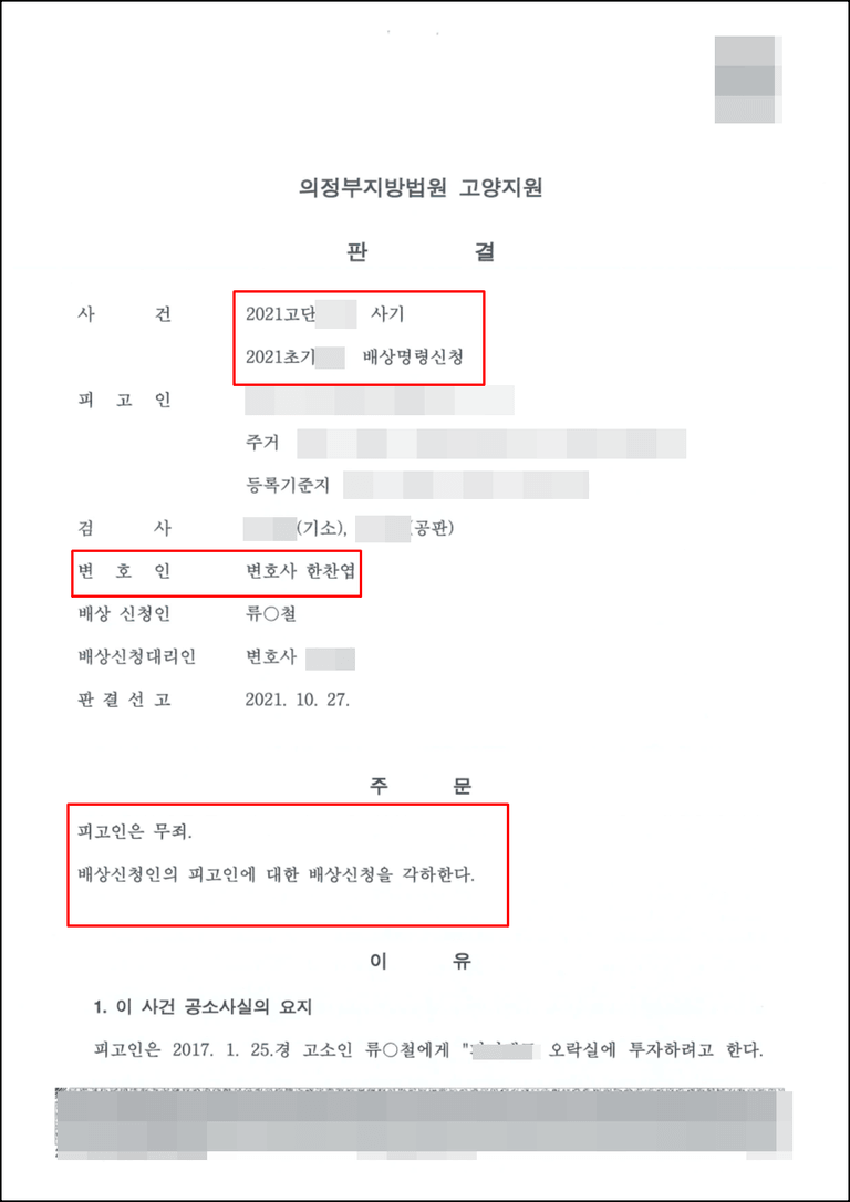 의뢰인은 '무죄'를 선고받았습니다.