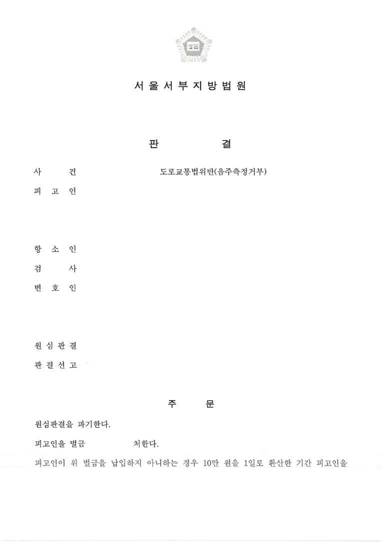 - 의뢰인은 음주측정거부 혐의로 1심에서 집행유예를 선고 받게 되었고, 항소심에서 감형을 받고자 법무법인과 상담을 진행한 후, 조력을 받기로 결정하였습니다.