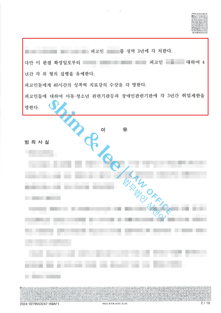 - 재판부에서는 피해자에 대한 반복적인 추행의 정도, 방식, 횟수 모두 죄질이 불량하다며 가해자에게 징역 3년, 집행유예 4년, 성폭력 치료강의 40시간, 취업제한 3년을 선고하였습니다.