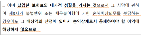 어떠한 사고로 인해서 지급받은 사망보험금은 내가 가입해서 부지런히 보험금을 납입했기 때문에, '이미 납입한 보험료의 대가적 성질로서 받는 것' 이지 이 사건 '손해' 내지는 '사고' 와는 전혀 인과관계가 없기 때문입니다.