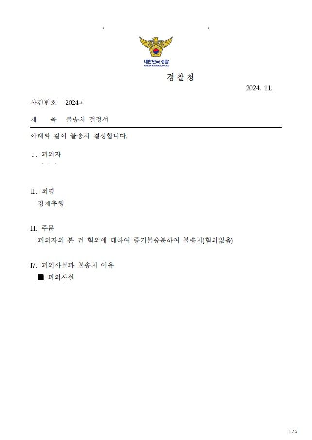 경찰은 변호인의 의견을 적극 수용하여 강제추행죄에 대해 증거불충분, 불송치 처분을 내렸습니다.