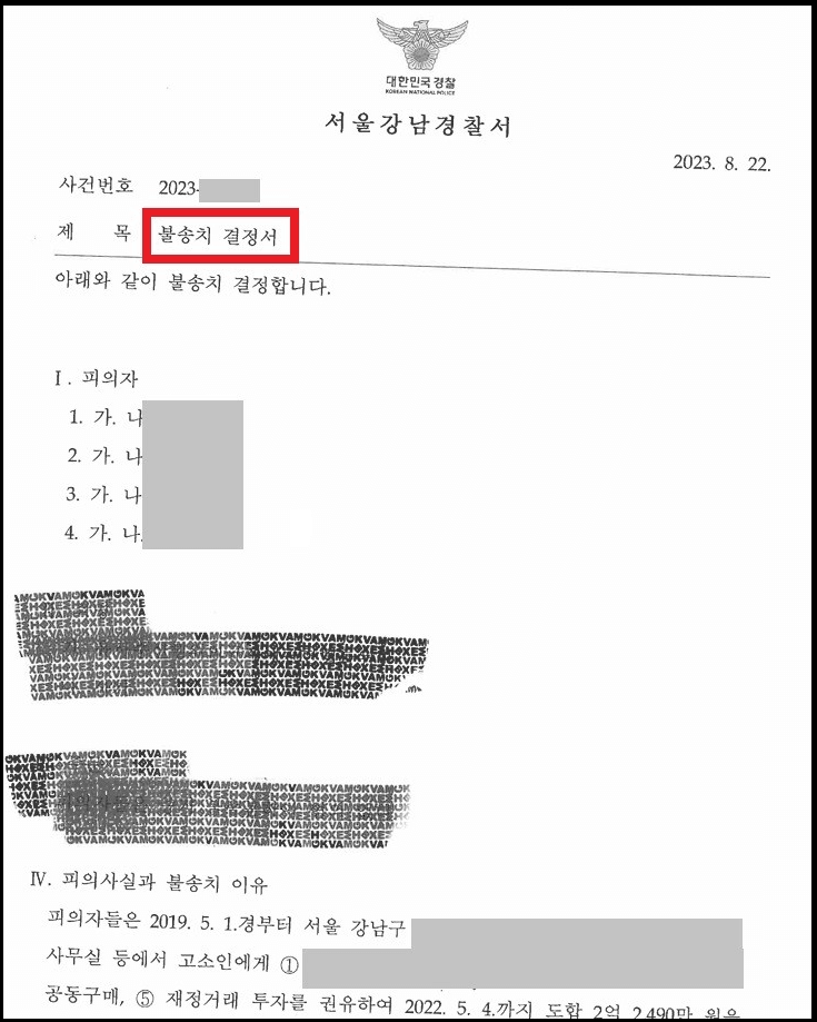 캡틴법률사무소는 투자사기, 유사수신 등 경찰간부 출신으로 경험한 경제범죄 수사경력을 바탕으로 축적된 노하우에 기반하여 경찰단계 무혐의 종결을 목표로 적극적으로 의견을 개진하였습니다.