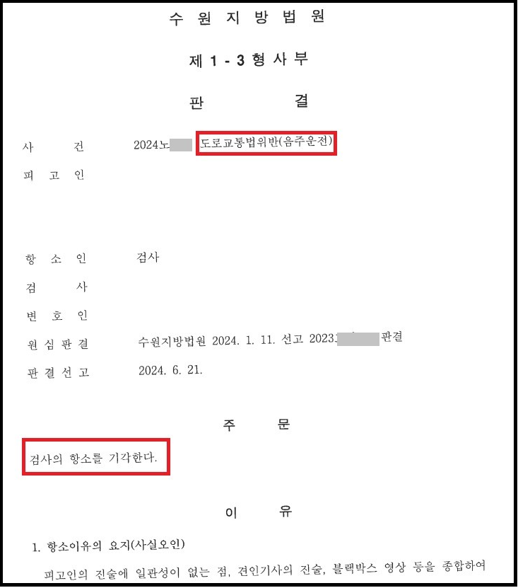 이 사건 재판부는 캡틴법률사무소의 주장을 받아들여 검사의 항소를 기각하는 판결을 함으로써 의뢰인은 의뢰인의 무죄가 확정되었고, 취소되었던 운전면허도 되살릴 수 있게 되었습니다.