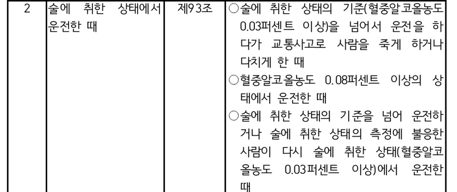 도로교통법은 혈중알코올농도가 0.03% 이상 0.08% 미만인 경우 1년 이하의 징역이나 500만 원 이하의 벌금에, 0.08% 이상 0.2% 미만인 경우 1년 이상 2년 이하의 징역이나 500만 원 이상 1,000만 원 이하의 벌금에, 0.2% 이상인 경우에는 2년 이상 5년 이하의 징역이나 1,000만 원 이상 2,000만 원 이하의 벌금에 처하도록 규정하고 있습니다.