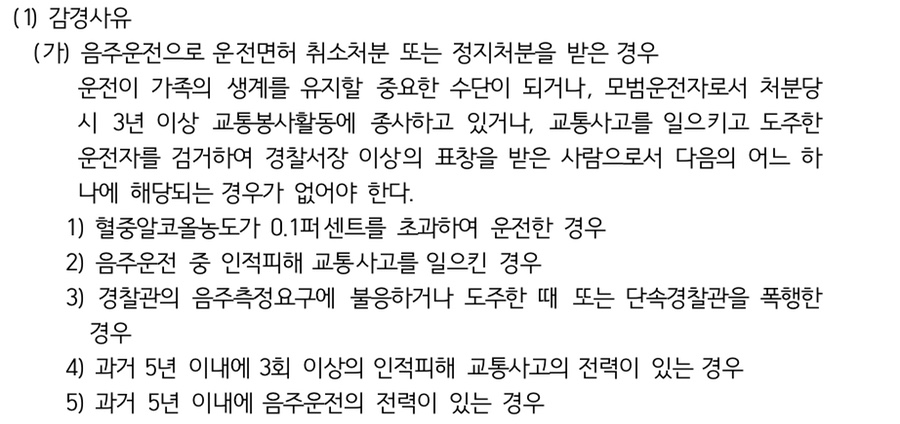 특히, '이의신청'은 운전이 가족의 생계를 유지할 중요한 수단이 되거나 모범운전자로서 처분 당시 3년 이상 교통봉사활동에 종사하고 있거나 교통사고를 일으키고 도주한 운전자를 검거하여 경찰서장 이상의 표창을 받은 사람으로서 아래의 어느 하나에 해당되는 경우가 없어야 한다고 규정하고 있습니다.