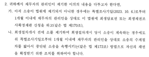 A) 소송 중이라면 이의자 전원을 상대방으로 해서 소송절차 수계신청을 해야합니다. 실무에서는 회생 채무자의 관리인이 있을 것이므로, 관리인을 상대로 수계 신청을 하게 됩니다.